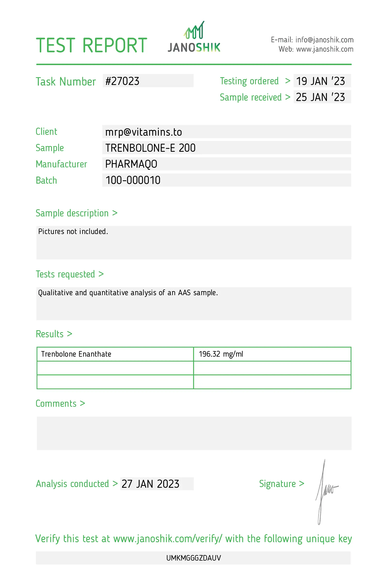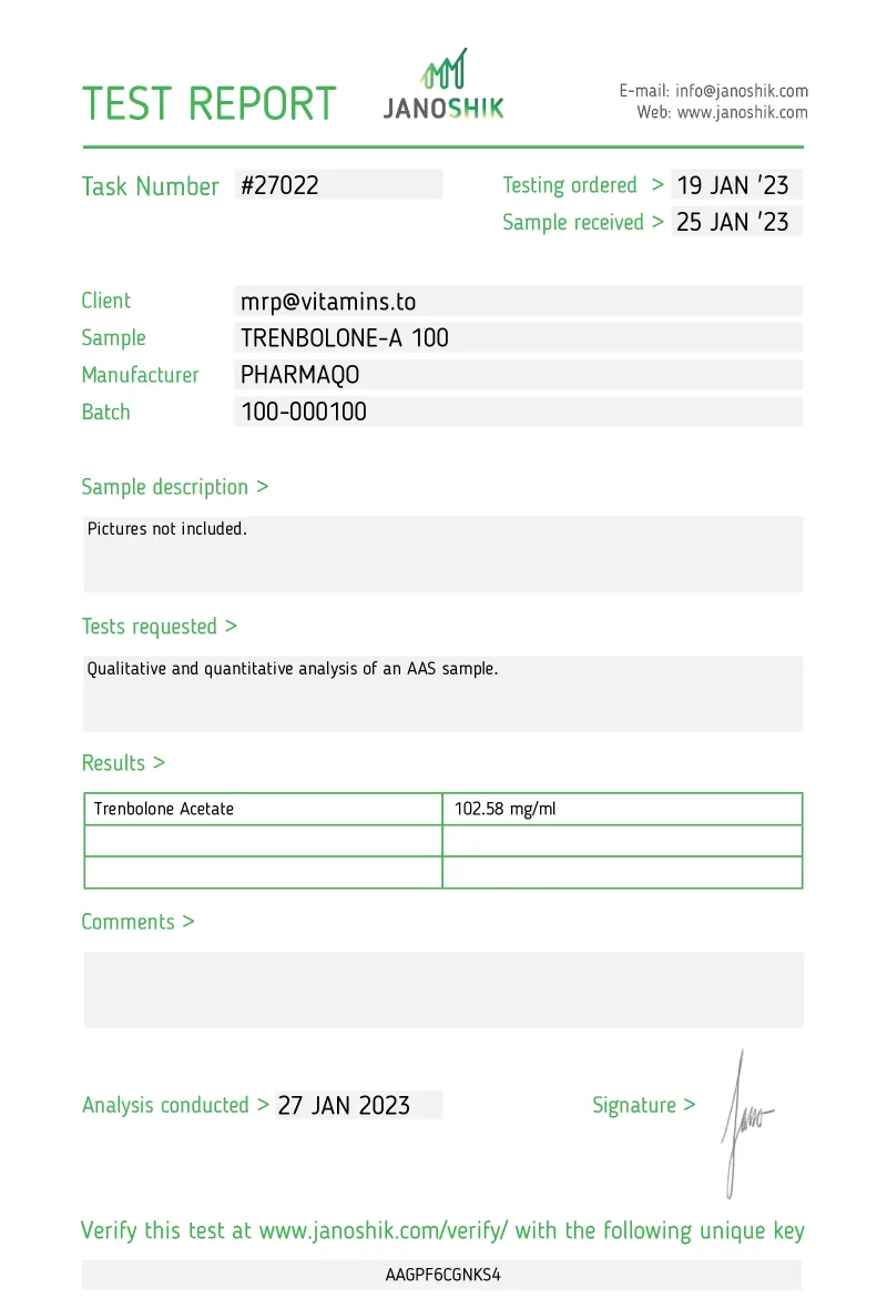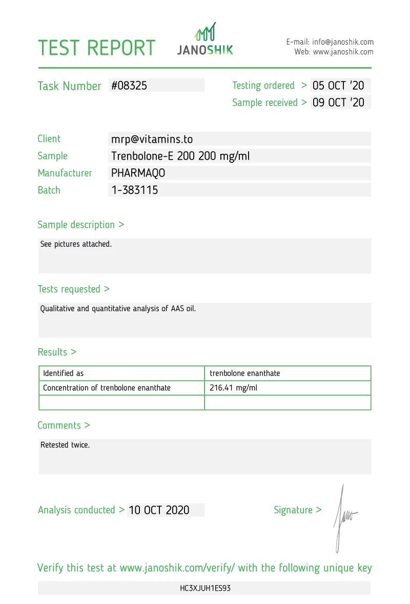 - How is the quality and purity of your Trenbolone esters verified? We provide access to third-party HPLC lab test reports confirming identity, concentration, and purity. Please refer to the “Verify Compound Integrity” section for examples and details.